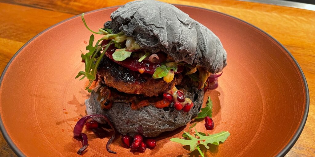 … alles, nur nicht fast… Hamburger mit schwarzem (grauen) Sauerteig-Buns, Rinds-Patties, gebackene Aubergine, Guacamole, gebratene Zwiebeln, gepickelte Randen, Granatapfel und Ruccola 🤗🤗🤗