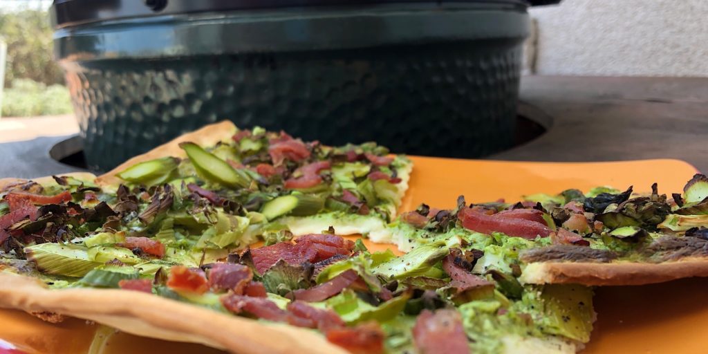… darf es auch ein kleiner Happen vom Big Green Egg sein! Flammkuchen mit grünem Spargel 🙃🙃🙃