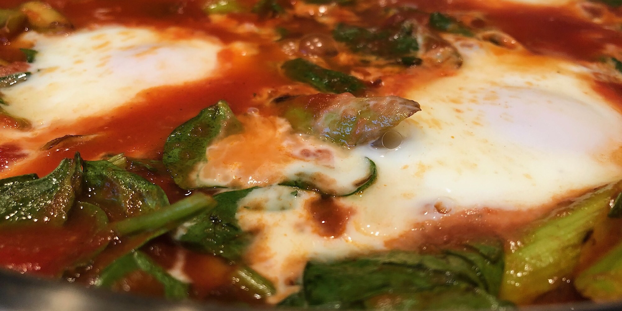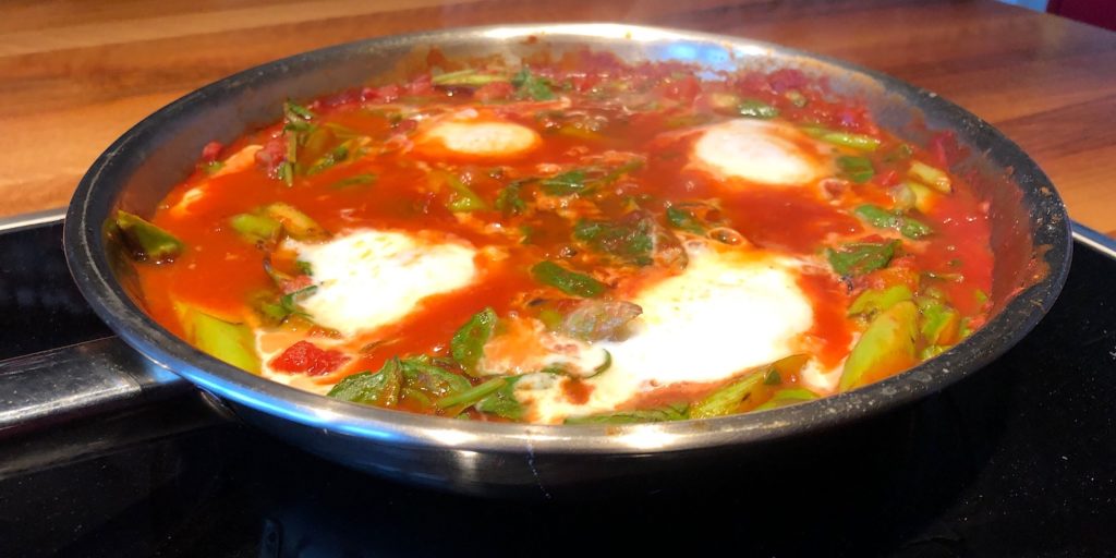 … gab es etwas, was wir schon lange kochen wollten: Spargel-Spinat-Shakshuka mit Bärlauch-Foccachia 👉 unbedingt ausprobieren!