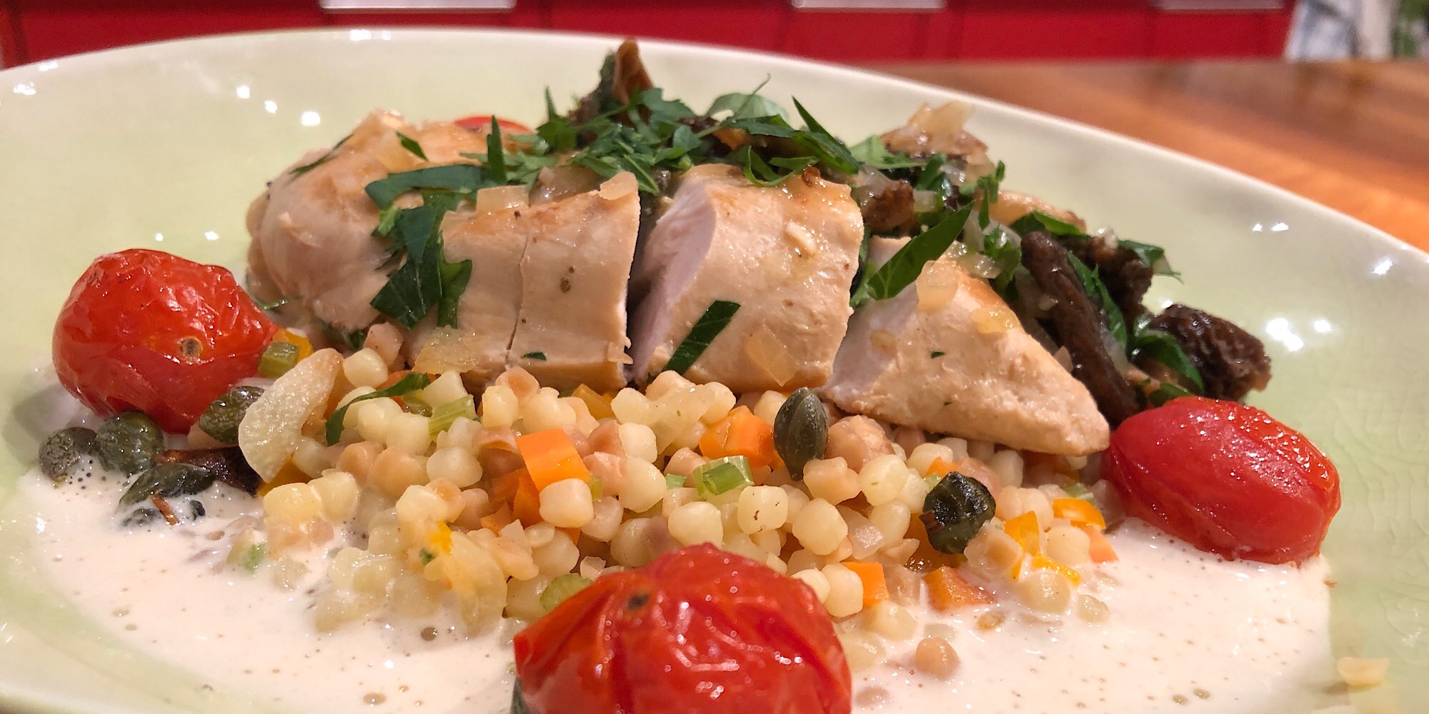 … mit Morcheln, Fregola Sarda, Rüebli, Peperoni und eben: Vin Jaune!