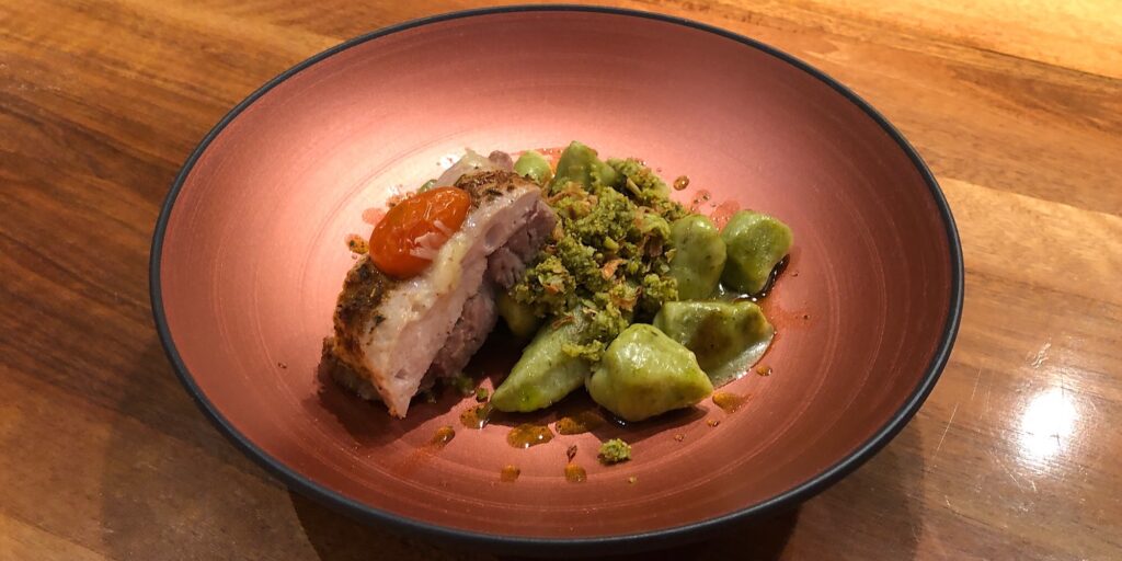 … und auch gleich eingeweiht: Bärlauchgnocchi mit Parmesan-Crumble und einem sanft gegarten Schweinchen 😆😆😆…