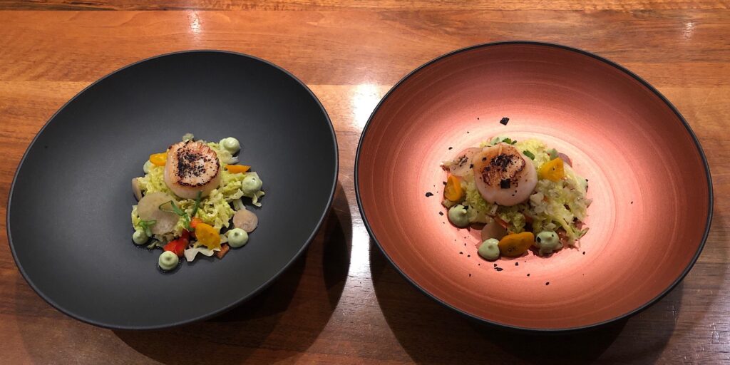 … Schwarz oder Kupfer? Links oder rechts? Jakobsmuschel, Wirz, Estragon, Kumquat-Chutney und gepickelten Radischen und Petersilienstengel