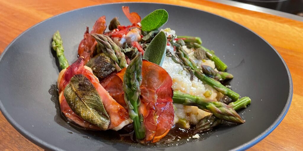 … am Abend: Spargelrisotto, Poulet-Saltimbocca und sonst noch so Knusper-Zeugs…
