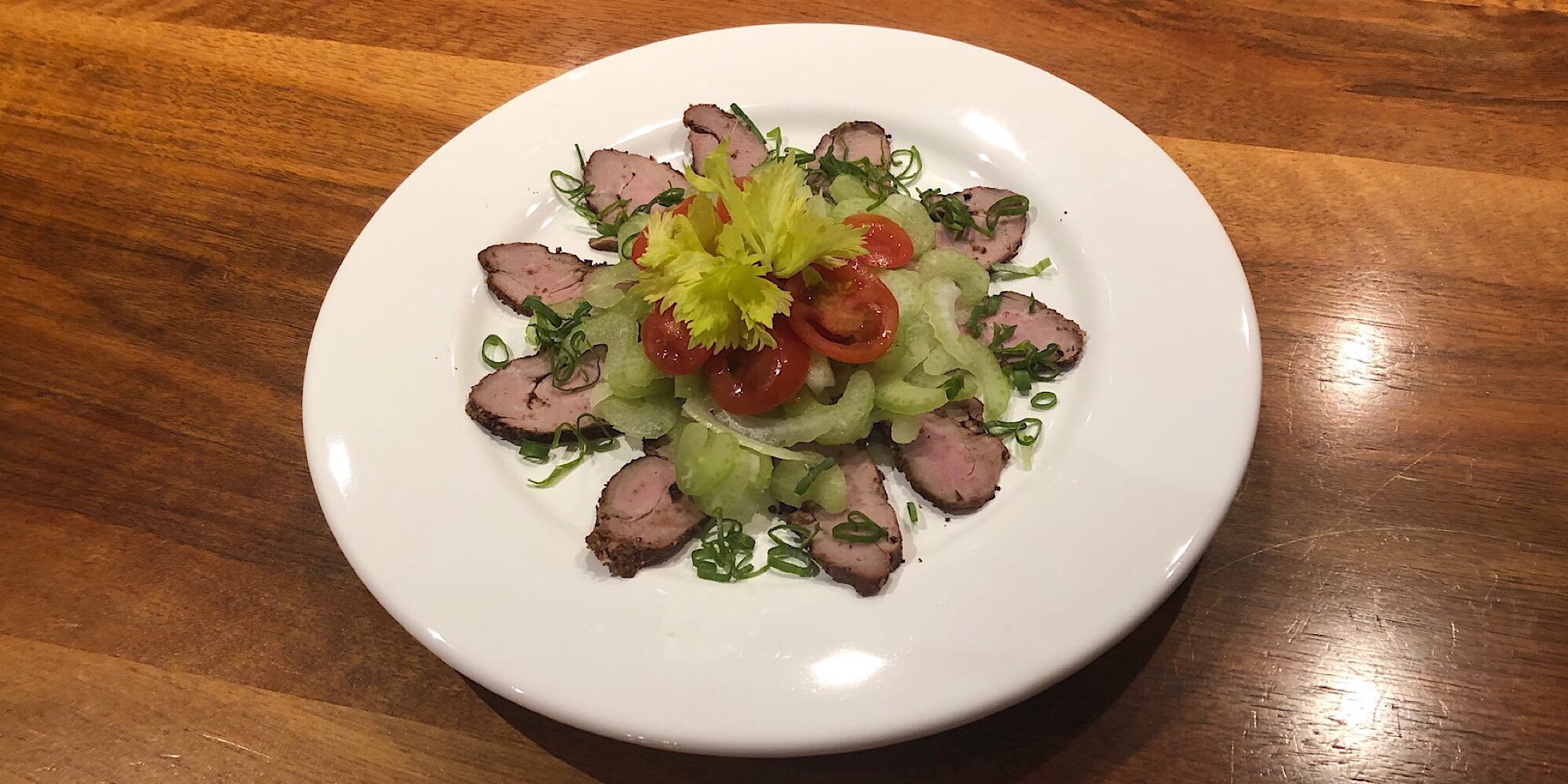 Im Kirschholz geräuchertes Schweinefilet (von vorgestern) mit Stangensellerie, Tomaten, Lauchzwiebeln und Senfdressing 😋😋😋!