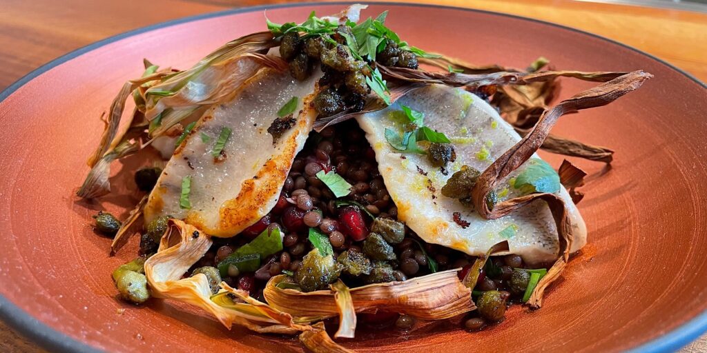 … und fein war‘s: Belugalinsen mit Granatapfel, Spargelchips, Eglifilet und gebratene Kapern 🤤